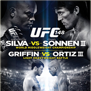 ROUND ONE: Silva came out throwing, and Sonnen took him down immediately. Silva held control of him as Sonnen landed strikes to the body. Silva avoided much of Sonnen's offense early. Sonnen passed to half guard. He landed a forearm. He landed some palm strikes to Silva's head as the Champ held control of him. Sonnen tried to pass, but Silva continued to keep control of him. Sonnen threw some knees to the body. Back to the palm strikes. Sonnen continued to work the palm strikes. He missed a stroked from the top and Silva continued to hol onto him. Sonnen landed some punches from the top. Dueling chants from the crowd. Sonnen continued to work from the top as Silva mostly neutralized his offense. He finally passed to mount. He landed a couple of shoulder strikes, but Silva held control of his body again. Sonnen rode out the round on top.